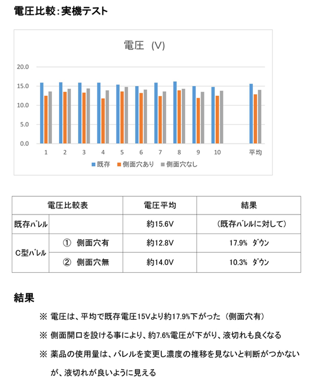 | コスト削減 | ・電気効率の改善(→クリックで表示:電圧比較テスト資料) ・素早い液切れにより薬品使用量・処理水を削減、めっき時間の短縮 (詳しくは↓以下↓の動画をご覧ください。) ・以下の参考動画では、右側がC型スリット式バレルです。左側の多孔式に比べて素早く液が切れていることがお分かりいただけると思います。 |