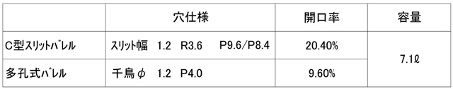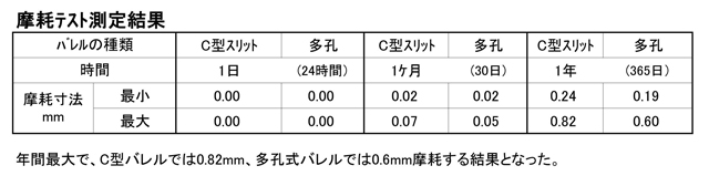 | ※各社設備仕様により多少の誤差は生じます。 ※多孔バレル、C型スリットバレル、それぞれ処理方法によりメリット・デメリットがあります。 開口面積が大きいことのデメリットとして、摩耗率の高さがあります。 (→クリックで表示:摩耗テスト資料) 詳しくはお問い合わせください ※磨耗テストについてはリード線芯先による磨耗は含んでおりません(各社芯先径が違う為) 芯先磨耗対策についてはご相談に応じさせて頂きます。 |